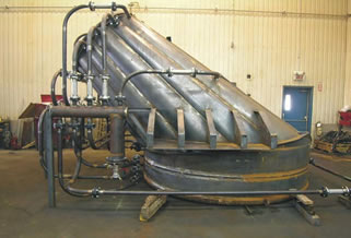 L’écumeuse mobile à scories, d’une longueur maximale (mais non limitée) de 10 pieds, a pour fonction de faciliter l’opération d’écumage des fours. Toutes les fonctions de l’écumeuse mobile à scories sont assurées par un système hydraulique, ce qui élimine au maximum l’effort physique de l’opérateur et lui permet d’être moins exposé à la chaleur. Les chenilles sont entraînées indépendamment. Cet arrangement permet de faire avancer ou reculer le véhicule et de le déplacer de gauche à droite. La rotation de la table tournante est limitée à 220 degrés par des butées mécaniques.